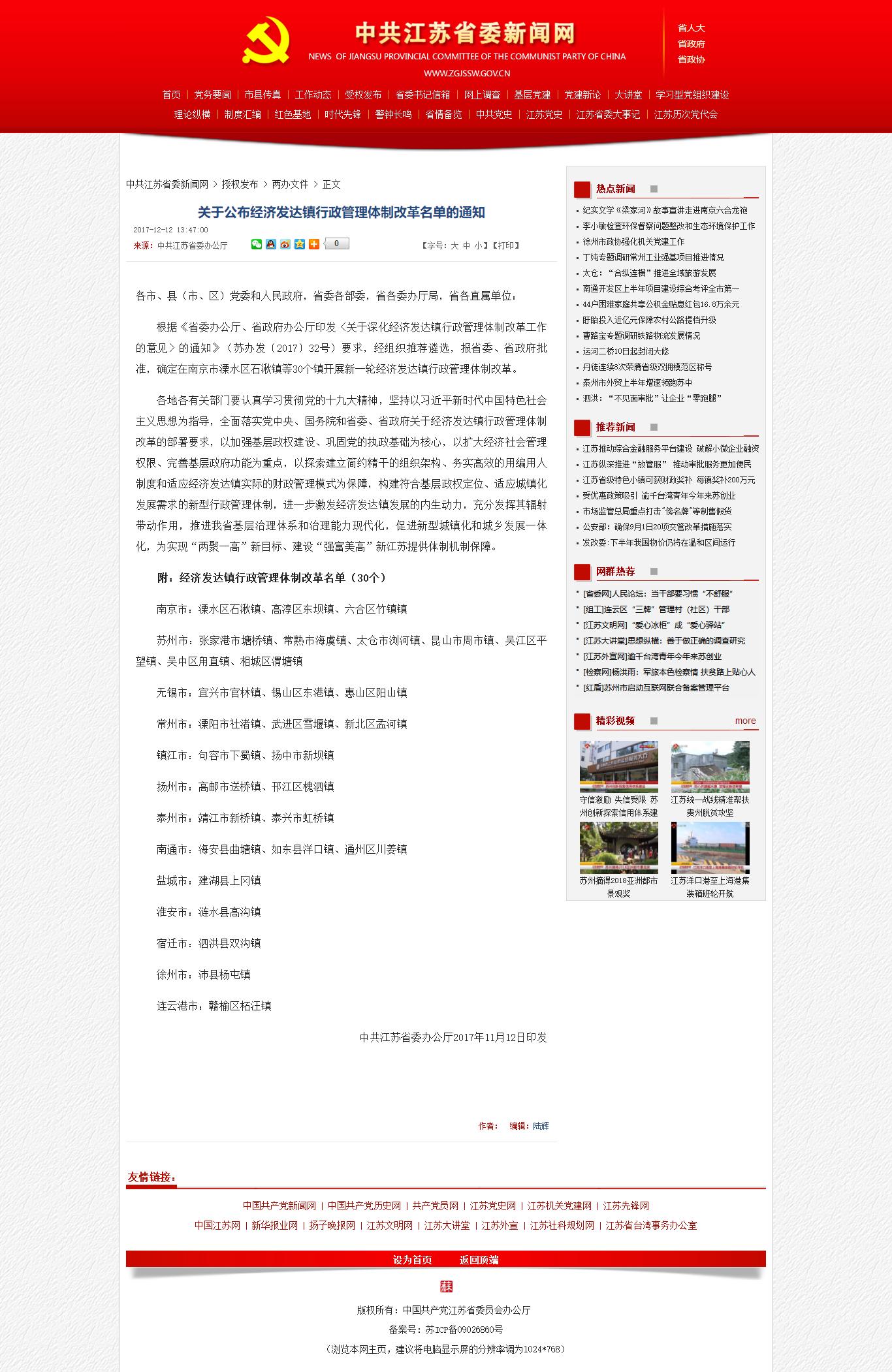 江苏省《关于公布经济发达镇行政管理体制改革名单的通知》