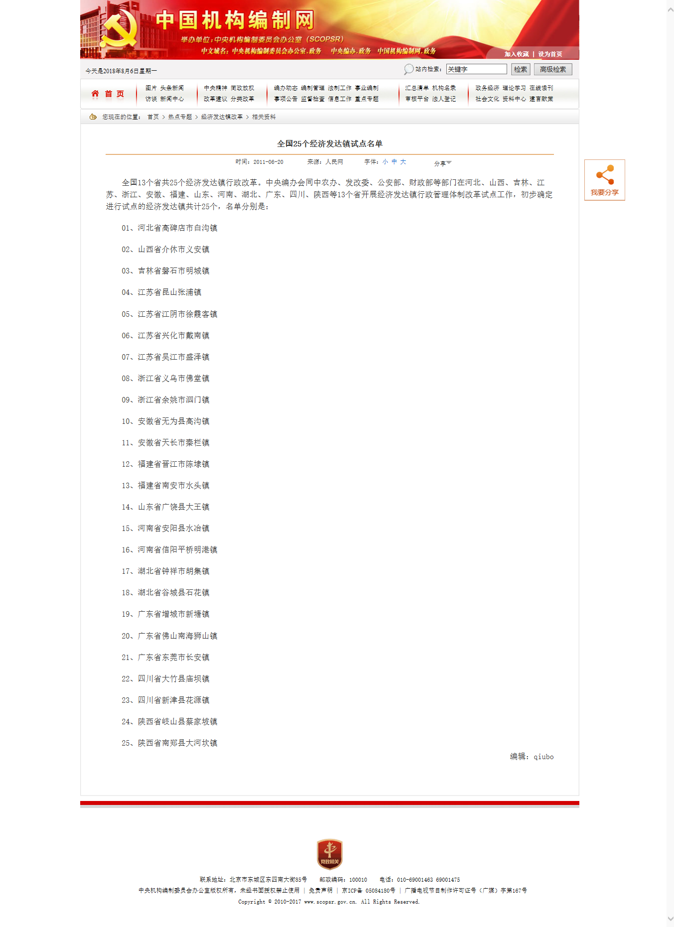 2010年6月,中央编办会同中农办、国家发改委、公安部、财政部等部门在13个省25个镇开展经济发达镇行政管理体制改革试点工作,并在工作座谈会发布全国25个经济发达镇试点名单。